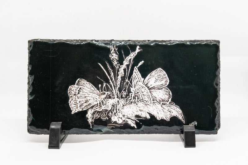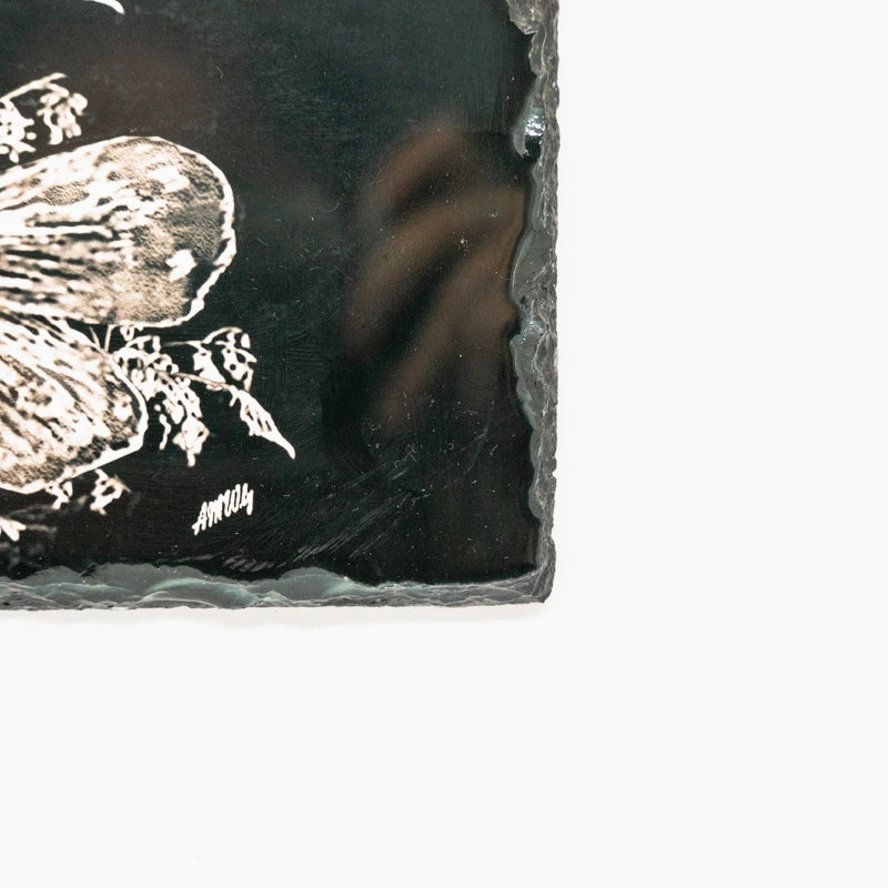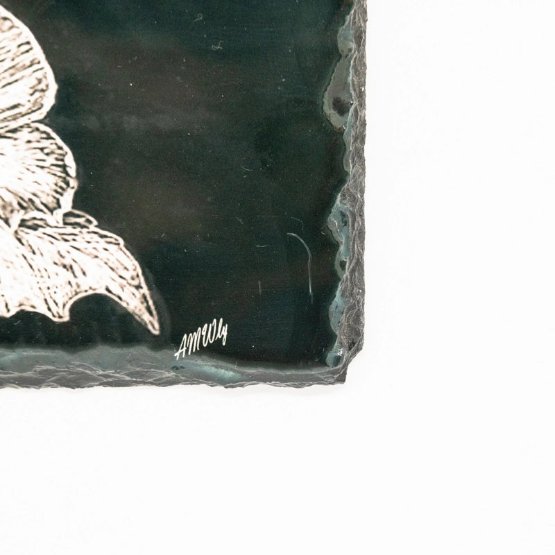 Printed on slate -from a scraperboard etching by Angela Winstanley - 18 x 9cm can be displayed on stand or wall hung.