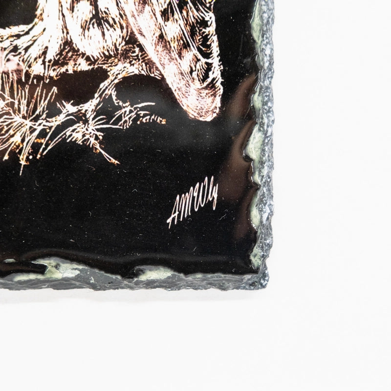 Printed on slate -from a scraperboard etching by Angela Winstanley - 18 x 9cm can be displayed on stand or wall hung.
