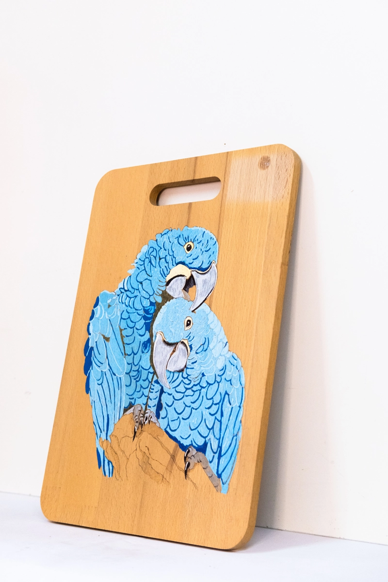 This beach wood chopping board features a beautiful acrylic picture of two embracing Blue Macaw parrots. The perfect addition to any kitchen, this board adds a touch of nature and color to your meal preparation. Made with the highest quality materials, it is both durable and stylish.