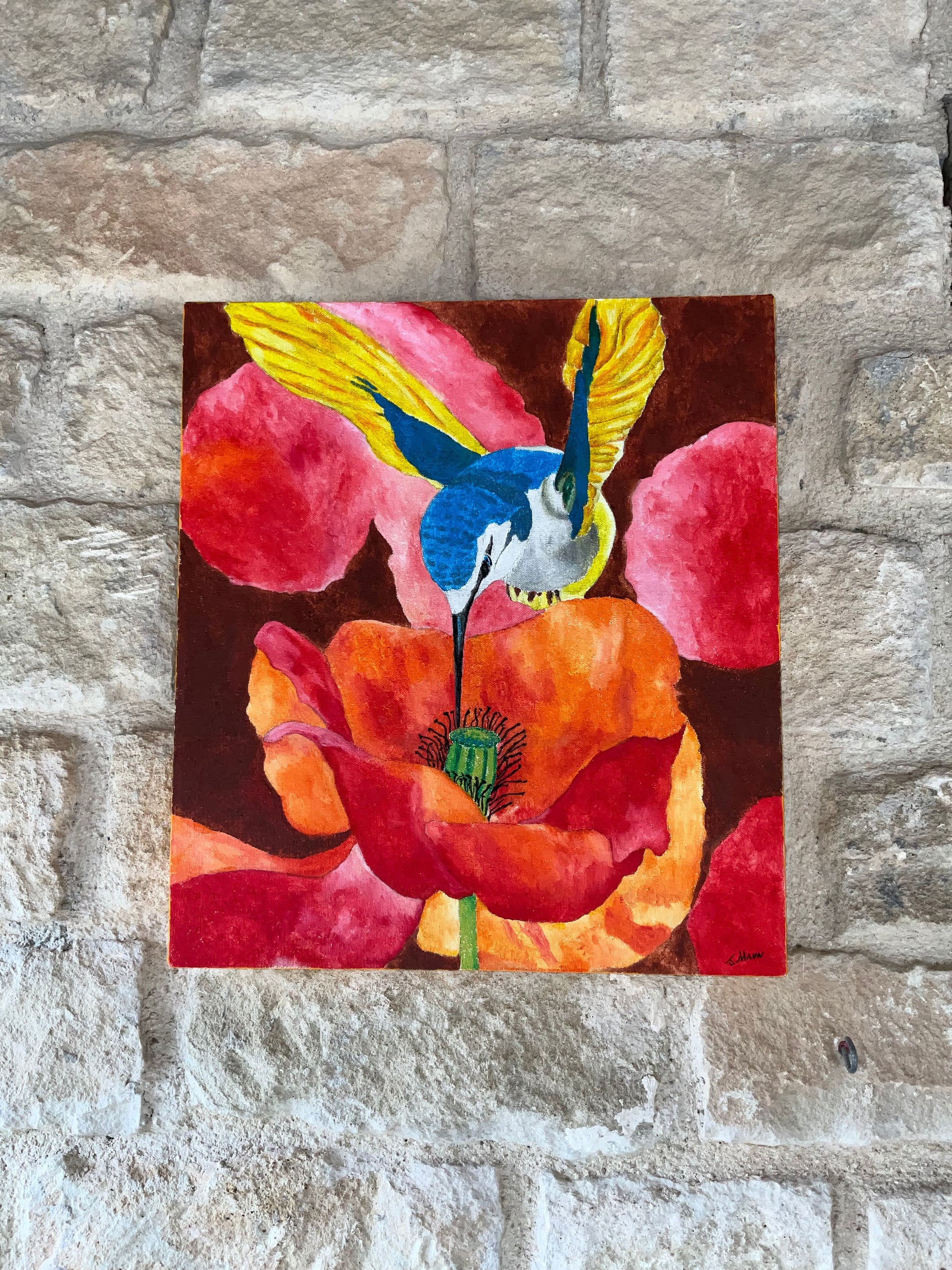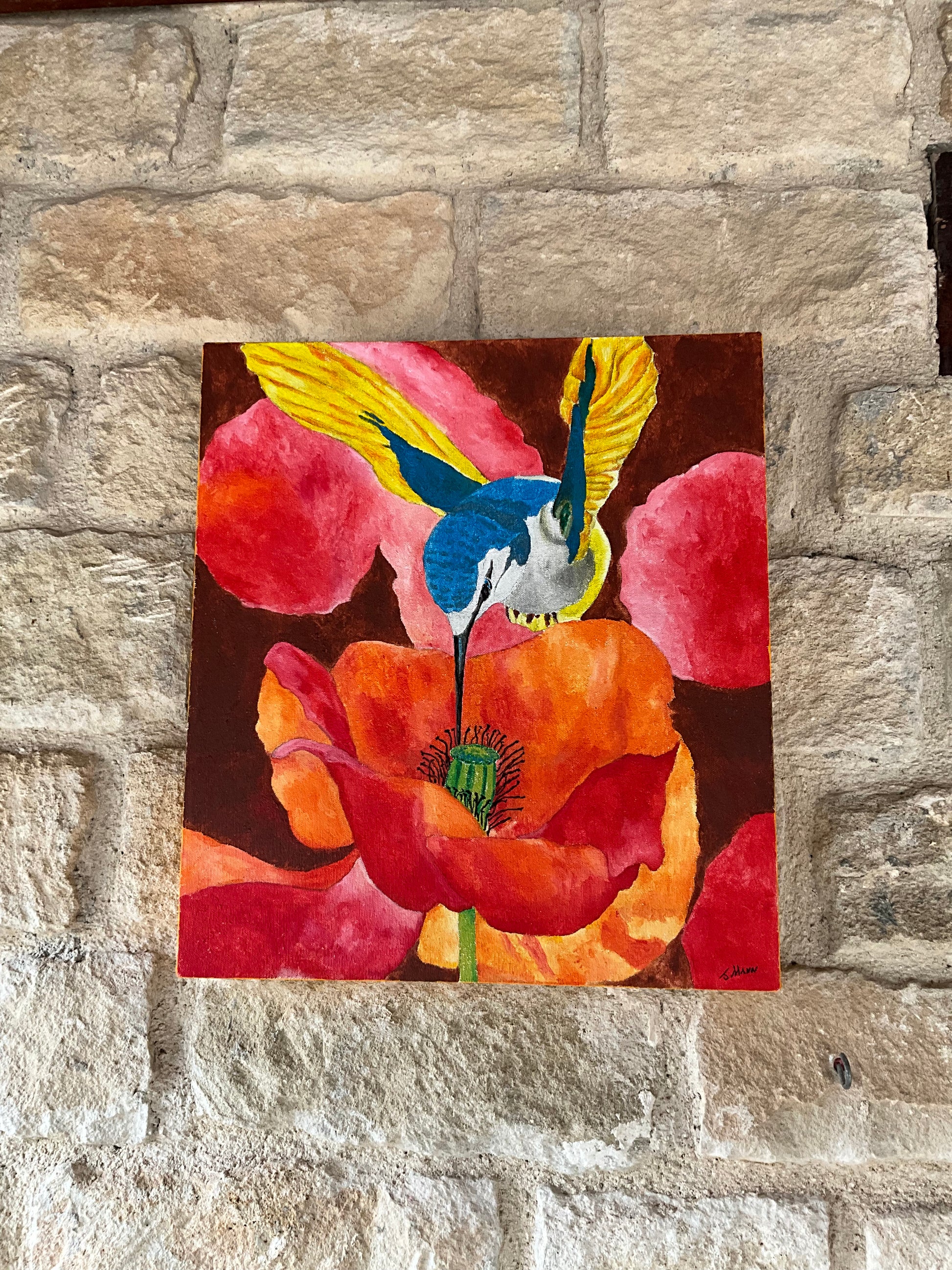 Experience the beauty of nature with this stunning oil painting on canvas. This vivid and brightly colored artwork depicts a hummingbird feeding on poppies, bringing a touch of life to any room. Expertly crafted at 40mm x 45mm, this piece is sure to make a statement in your home.