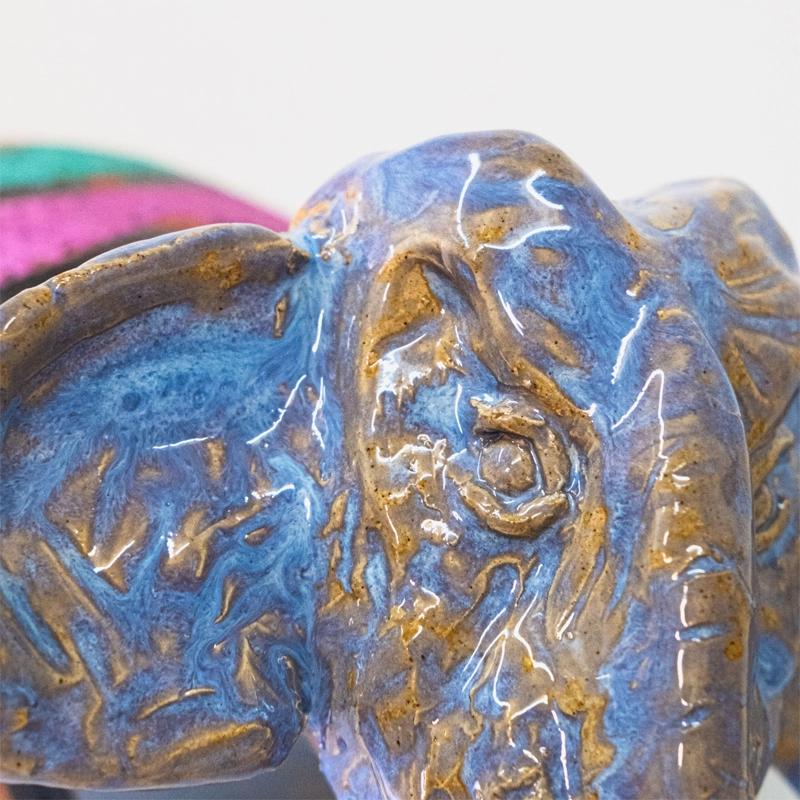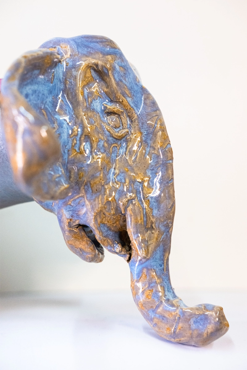 Gourd lamp wood-burnt, carved and decorated with metallic acrylics as the body of an Indian elephant with a ceramic head. 20cm tall.