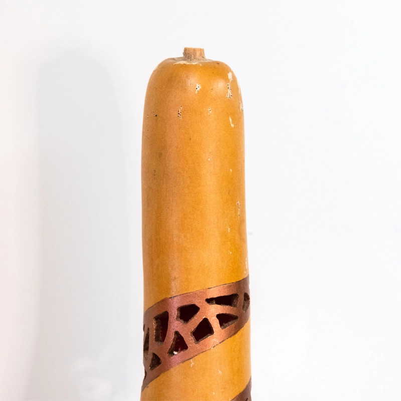 A delightfully carved gourd lamp, depicting Calla-lilies growing on trellis. Wood-burnt, carved and finished in wellburn inks, mounted on a metal tripod stand. Mains powered. 58cm tall.