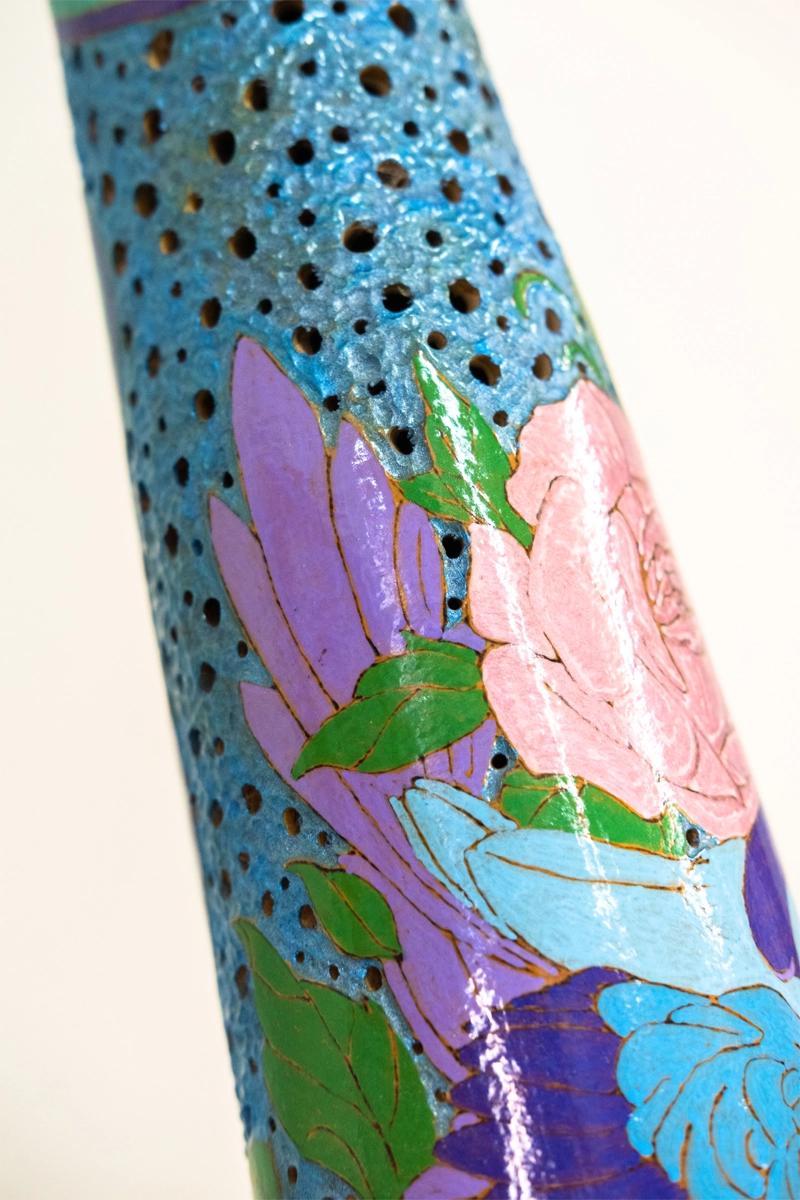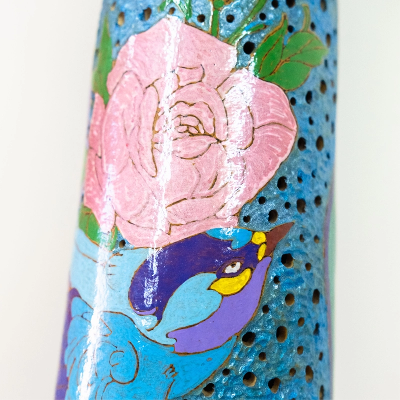 A gourd lamp depicting a bird and pink rose mounted on a hardwood base. Wood-burnt, carved and finished with acrylics. Mains powered. 60cm tall.