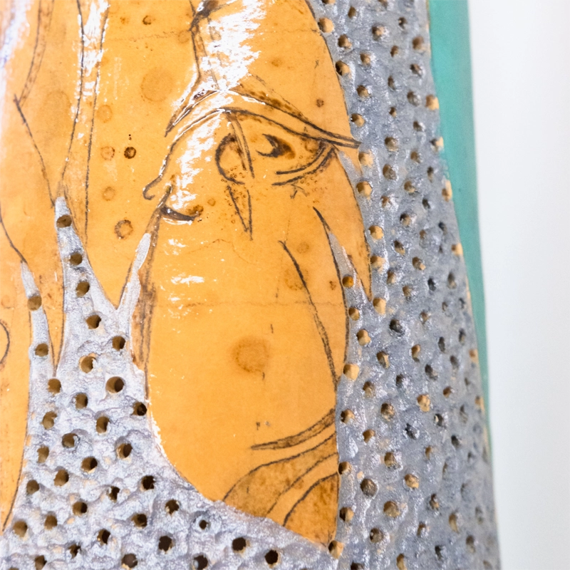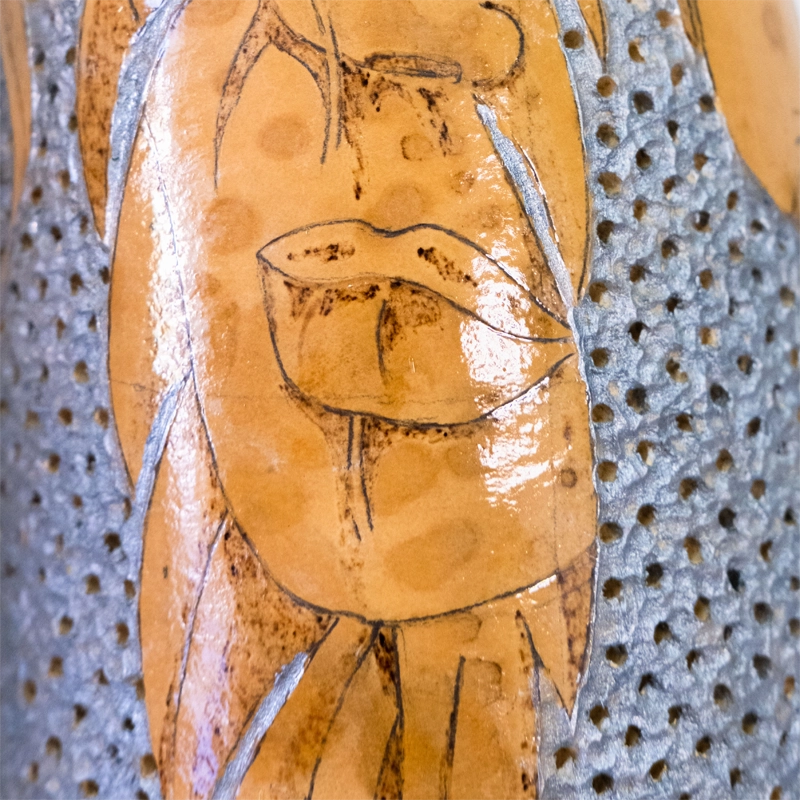 Gourd lamp wood-burnt and carved to form a face on a feather, finished with acrylics on a wooden base. Mains powered. 58cm tall.