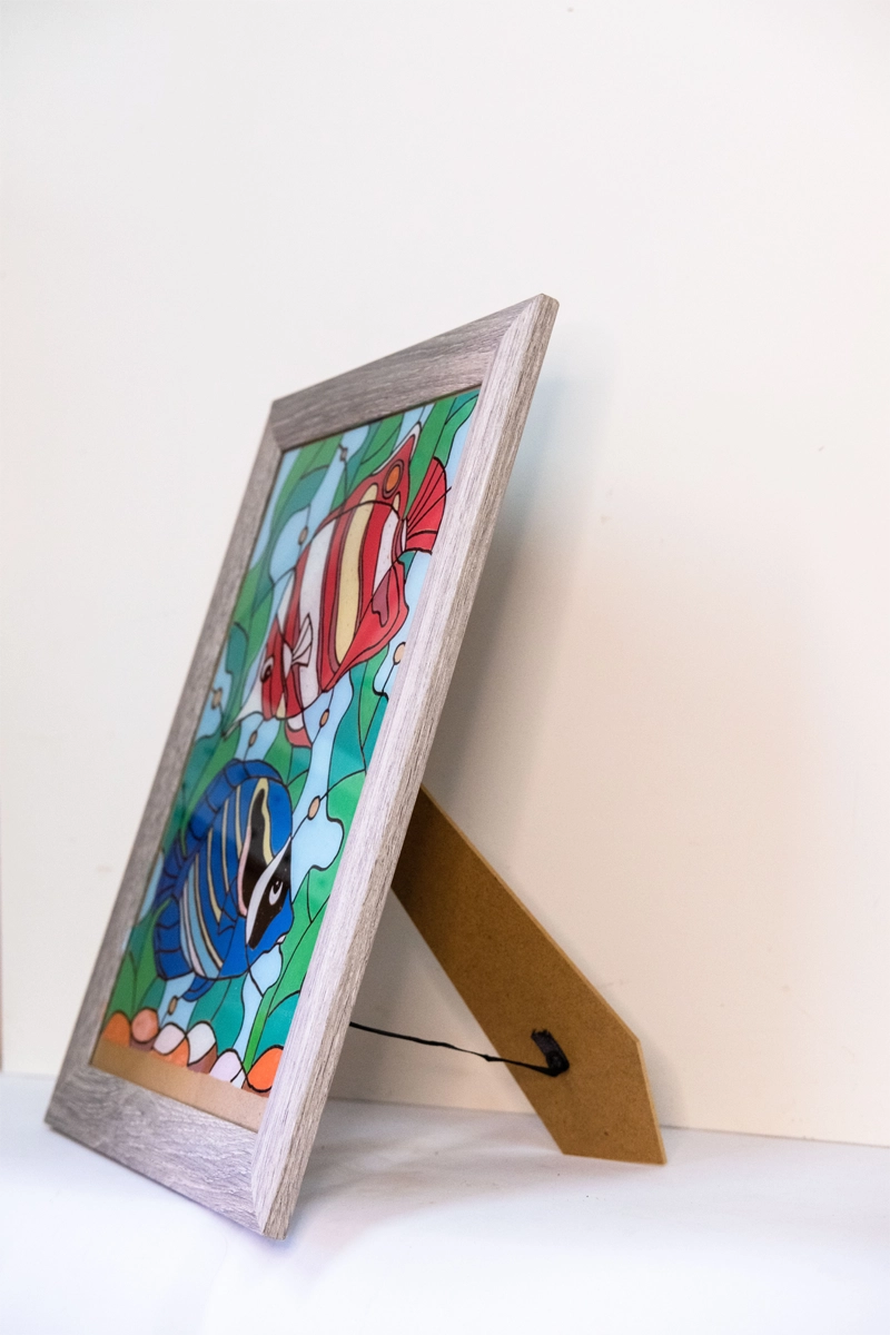 Experience the captivating beauty of our Abstract Fish painting on glass. Featuring vivid colors and a unique abstract design, this piece will add a modern touch to any room. Made with expert precision and creativity, it's the perfect addition to any art collection. Bring the underwater world to life in your home with this stunning piece of art. Frame 14” x 10”