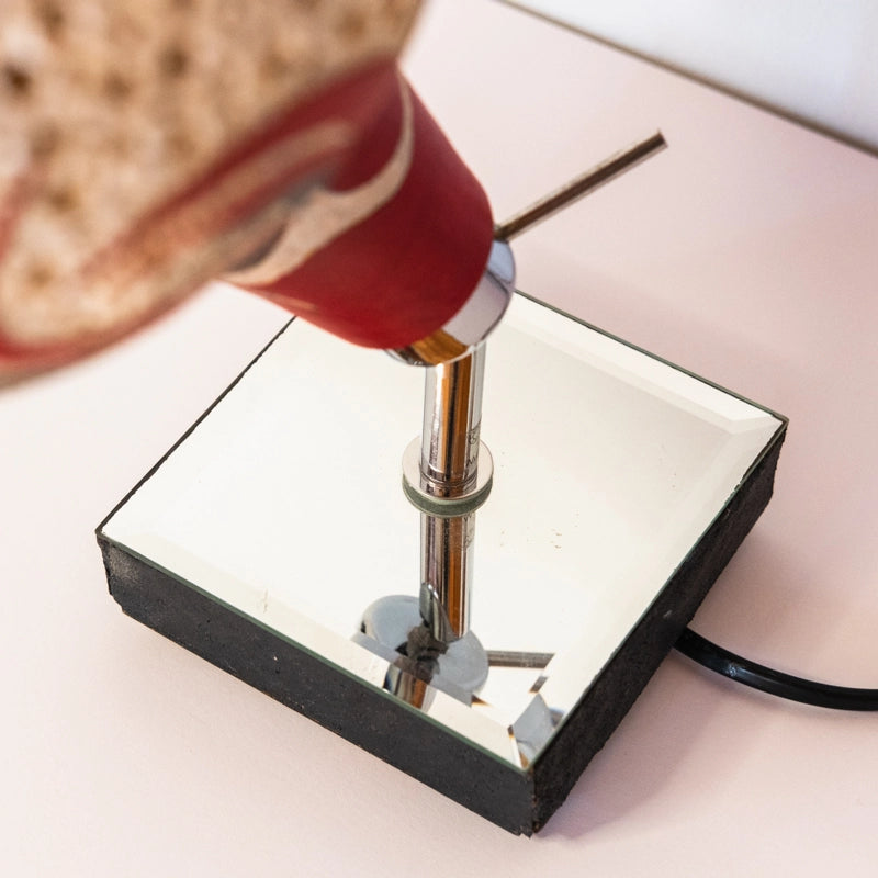 Expertly crafted and aesthetically pleasing, this gourd lamp features exquisite wood-burning, intricate carvings, and a stunning finish using Wellburn inks. It is elegantly displayed on a mirrored wooden base for a touch of sophistication.