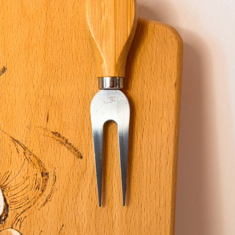 Crafted from beach wood, the Celestial Kiss cheese board features two profile faces on the brink of a romantic embrace. Adorned with hidden celestial objects, this unique board is the perfect centerpiece for any gathering. Complete with an attached cheese fork, it's a functional and visually stunning addition to your kitchen.