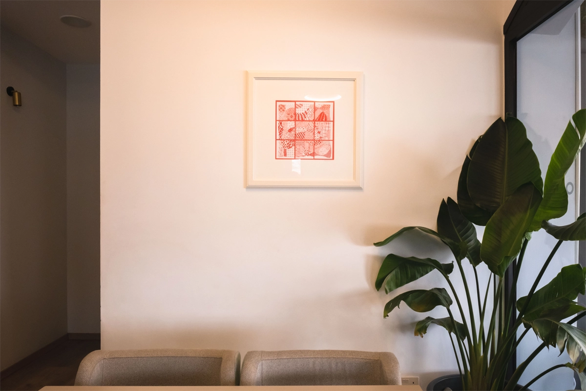 Original, Zentangle pattern drawing used red acrylic ink on archival paper, mounted on red mountboard with white mount/matt in a white frame. Signed by the artist, Marie Huntrods.