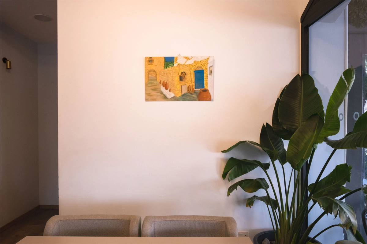The Cypriot courtyard features a captivating painting that adds a touch of artistry to its well-maintained surroundings.